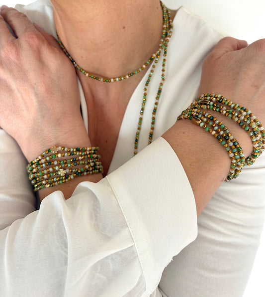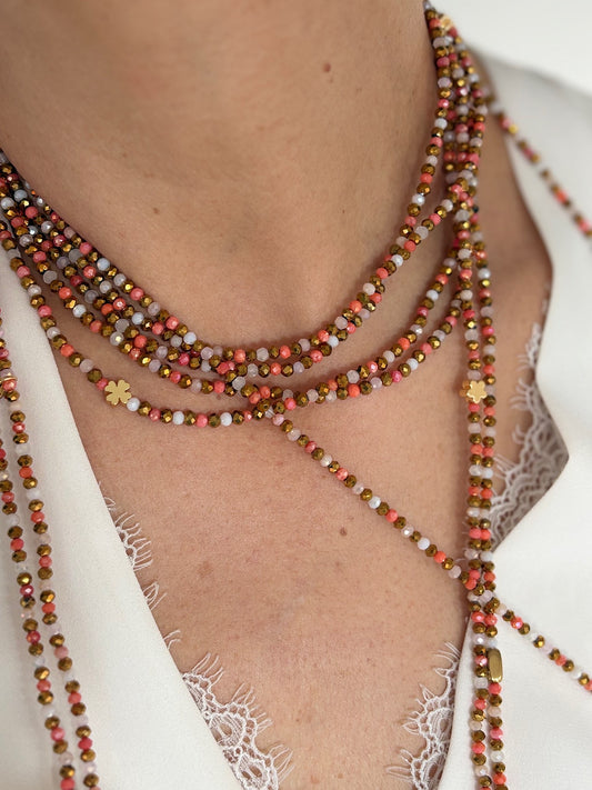 Les sautoirs FAIS PAS TA STEPH s’adaptent à toutes tes envies. Grâce à leur montage sur fil élastique, ils se portent de plusieurs façons : en sautoir (1 tour) pour une allure fluide et élégante, en ras de cou (3 tours)pour un effet structuré, en bracelet manchette (7 tours) pour une touche originale. C’est toi qui choisis, selon ton envie !