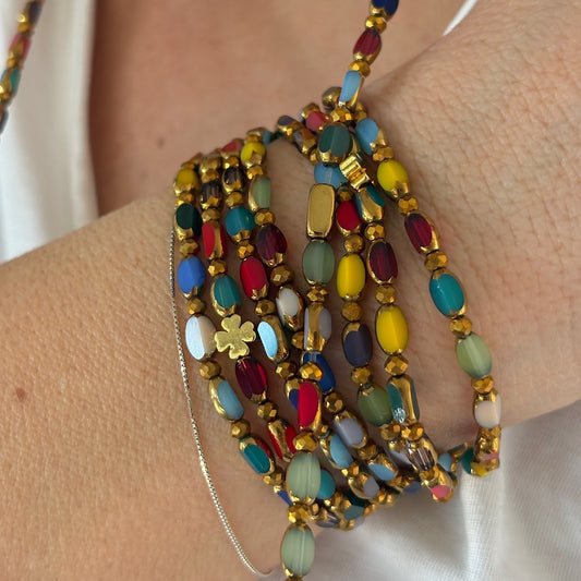 Tous mes sautoirs sont montés sur un élastique ultra résistant Beadalon et se portent comme tu veux : en sautoir 1 tour, ras de cou 3 tours ou manchette 7 tours. À porter seul ou en accumulation, selon ton envie du jour : c’est ton style, c’est toi qui décides.