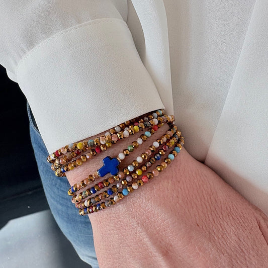 Tous mes sautoirs sont montés sur un élastique ultra résistant Beadalon et se portent comme tu veux : en sautoir 1 tour, ras de cou 3 tours ou manchette 7 tours. À porter seul ou en accumulation, selon ton envie du jour : c’est ton style, c’est toi qui décides.