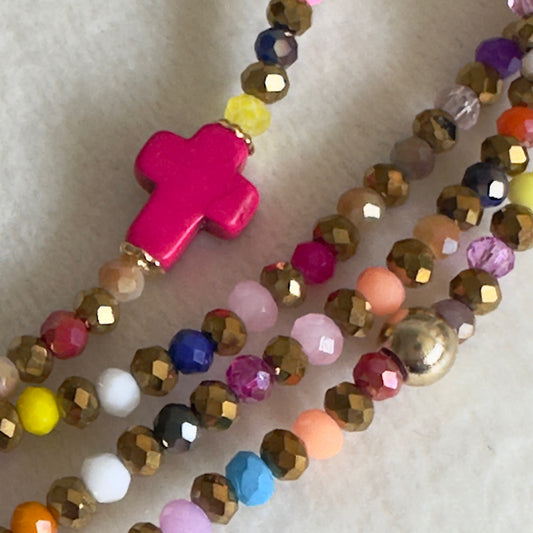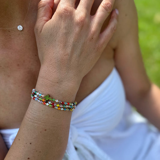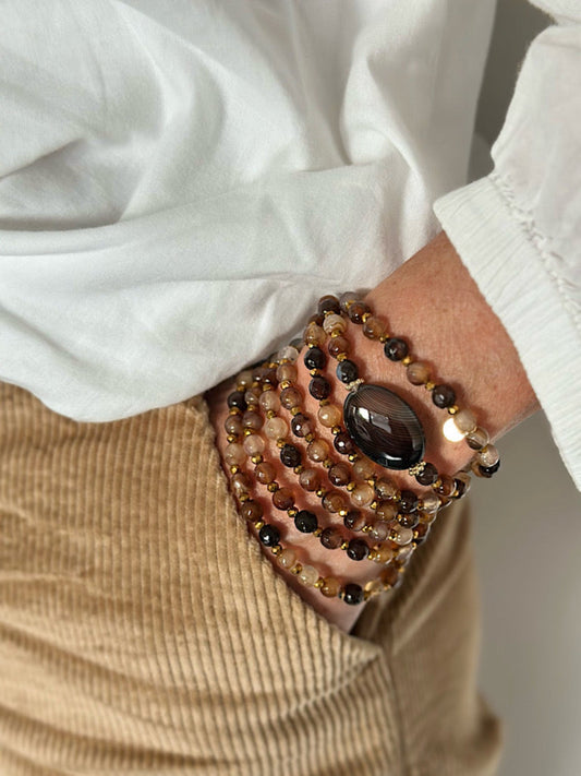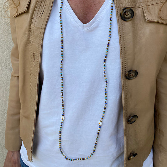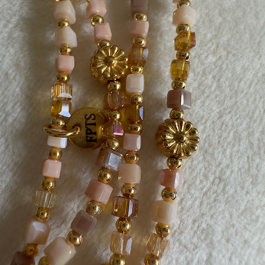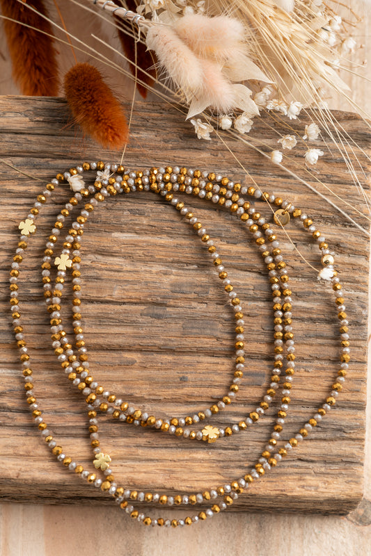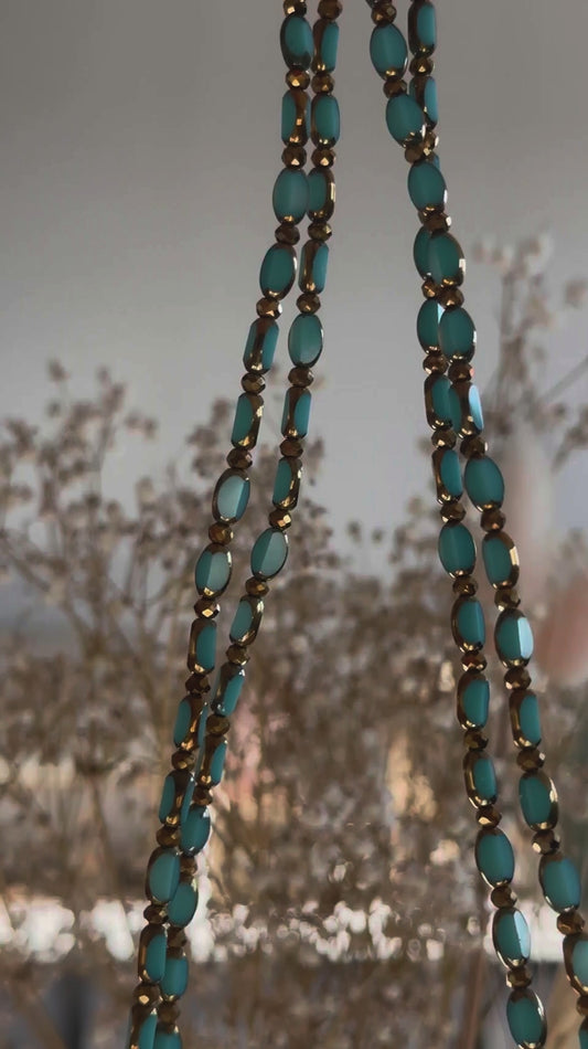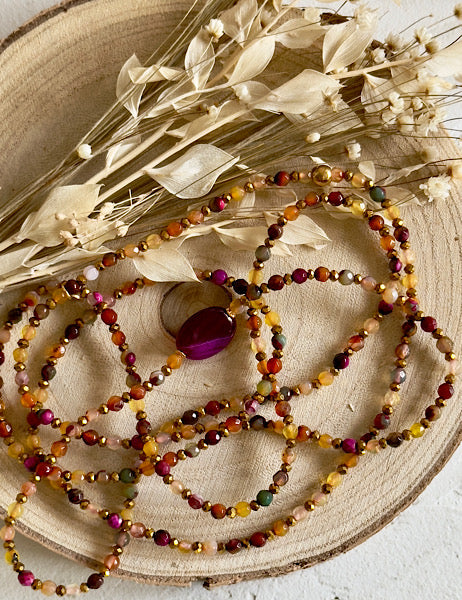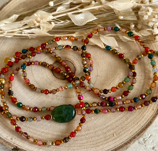 Tous mes sautoirs sont montés sur un élastique ultra résistant Beadalon et se portent comme tu veux : en sautoir 1 tour, ras de cou 3 tours ou manchette 7 tours. À porter seul ou en accumulation, selon ton envie du jour : c’est ton style, c’est toi qui décides.