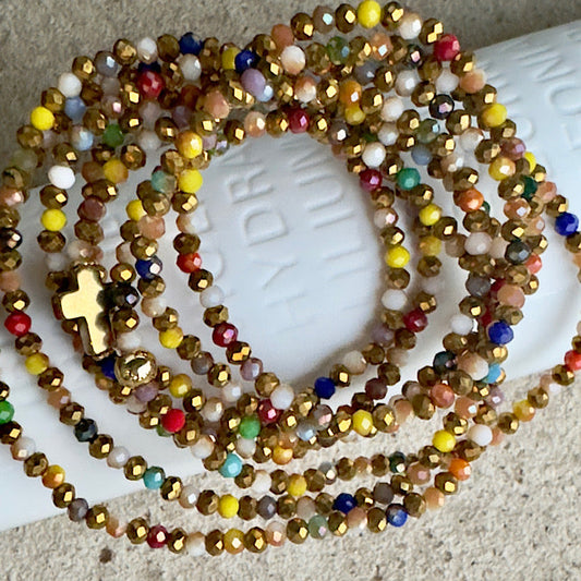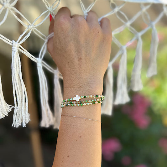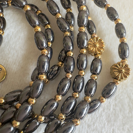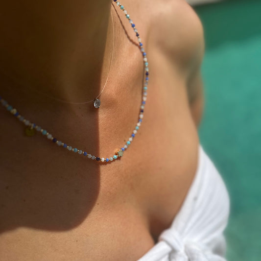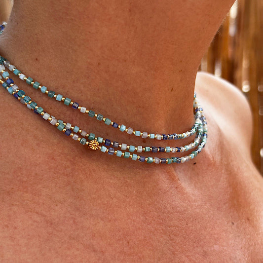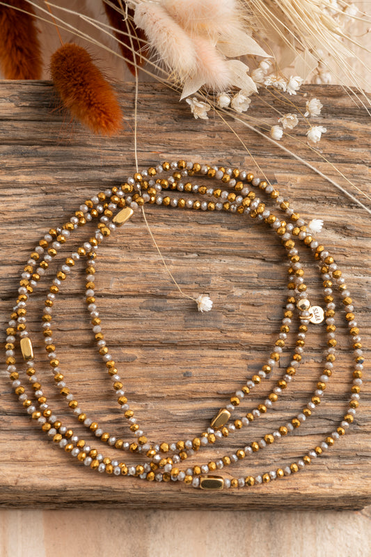 Tous mes sautoirs sont montés sur un élastique ultra résistant Beadalon et se portent comme tu veux : en sautoir 1 tour, ras de cou 3 tours ou manchette 7 tours. À porter seul ou en accumulation, selon ton envie du jour : c’est ton style, c’est toi qui décides.