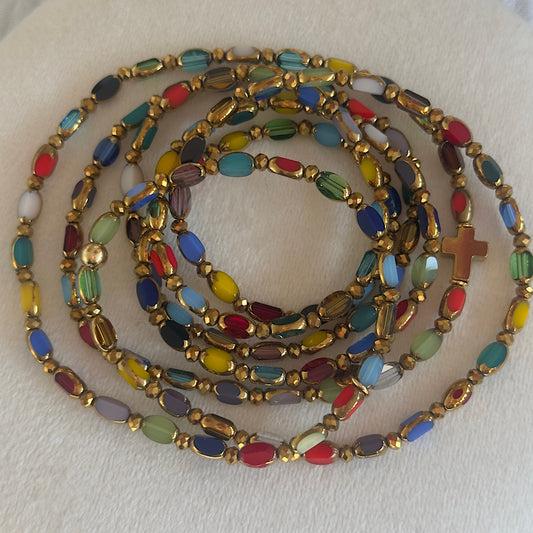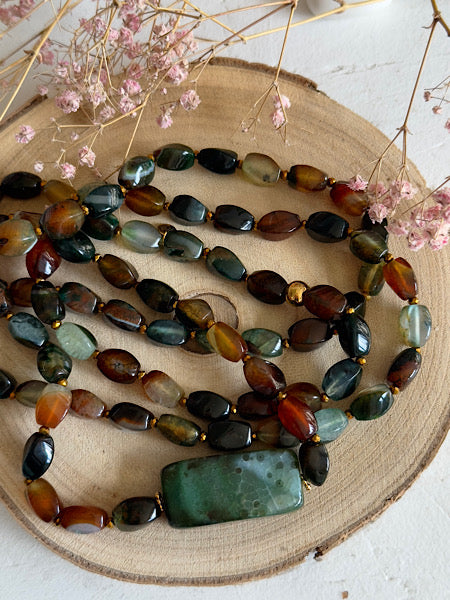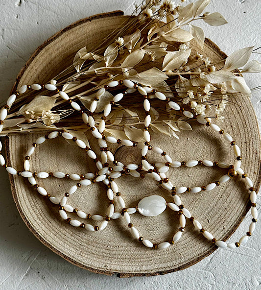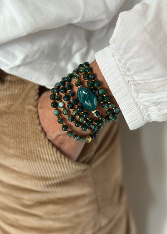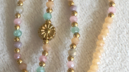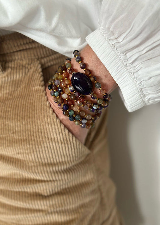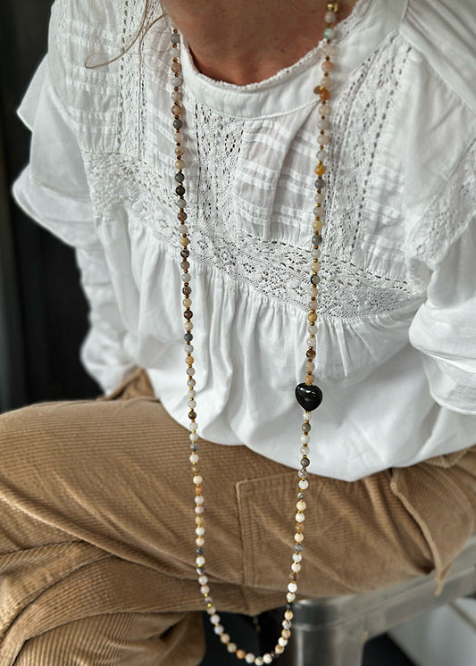 Tous mes sautoirs sont montés sur un élastique ultra résistant Beadalon et se portent comme tu veux : en sautoir 1 tour, ras de cou 3 tours ou manchette 7 tours. À porter seul ou en accumulation, selon ton envie du jour : c’est ton style, c’est toi qui décides.