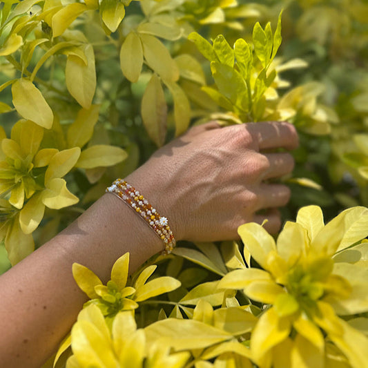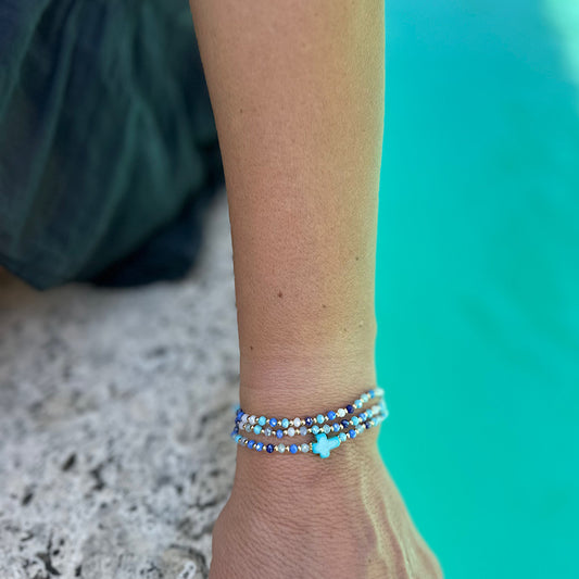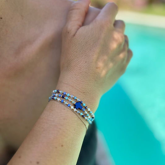 Tous mes sautoirs sont montés sur un élastique ultra résistant Beadalon et se portent comme tu veux : en sautoir 1 tour, ras de cou 3 tours ou manchette 7 tours. À porter seul ou en accumulation, selon ton envie du jour : c’est ton style, c’est toi qui décides.