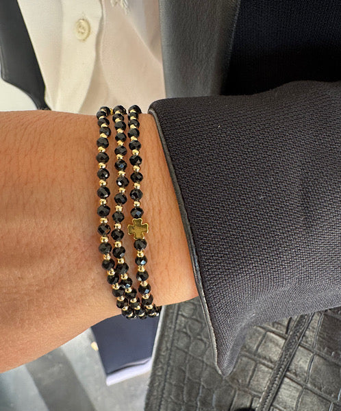 Élégant et intemporel, le Mini Noir Trèfles Dorés mise sur le contraste fort entre les perles de verre noires et les trèfles dorés.